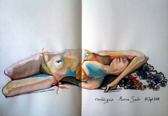 Ya sabemos que yo siempre empiezo mis dibujos por los ojos, pero esta vez tuve que empezar por el ombligo. Anoche lo vi bailar, en el centro del cuerpo de Marina. Bailaba con la respiración y con el silencio, bailaba con la quietud, con la tensión de lo que está a punto de estallar. Bailaba con los ojos, bailaba a gritos.